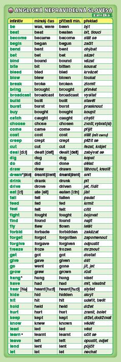 - obsahuje tvary minulého času a příčestí minulého nejužívanějších anglických nepravidelných sloves