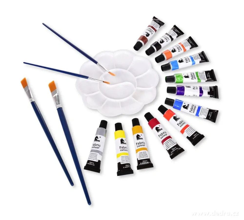 - 12 odstínů dekorativních barev na textil (lehce transparentní, rychleschnoucí), na vodní bázi, objem jedné barvy 12 ml.,